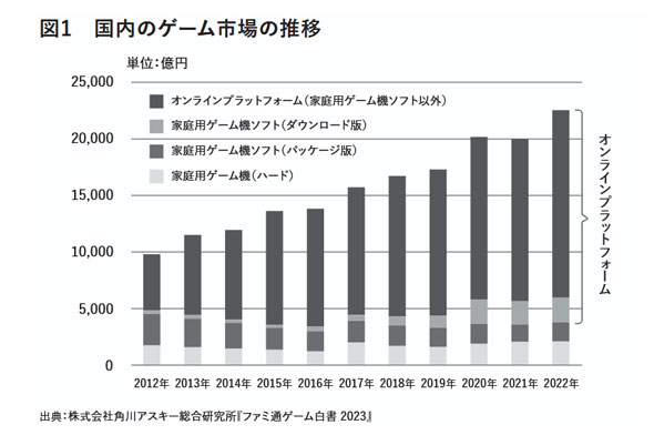 市場規模としても、毎年右肩上がりになっています。角川アスキー総合研究所の調査によると、2012年の国内市場規模は9800億円でしたが、2022年には2兆316億円と倍増しています。世界市場を見ても、2021年には1927億ドル(約28兆9050億円)に達しており、2026年には2057億ドル(約30兆8550億円)まで到達すると予測されています。