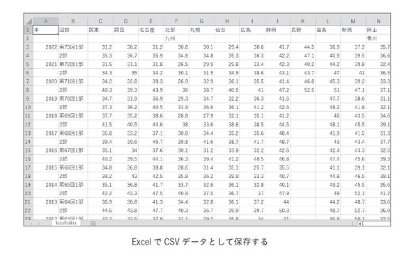「NHK紅白歌合戦 視聴率データ」「NHK大河ドラマ 視聴率データ」とGoogleで検索すればすぐにWeb上の表が見つかります。これらの表をコピー&ペーストでExcelに入れてCSVデータとして保存しました。