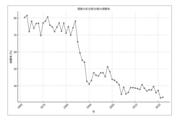 1960年代には80%もあった視聴率が80年代後半に大きく落ち込み、その後も低落傾向にあることが分かります。
