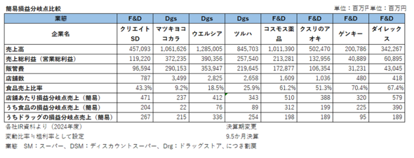 九州や北陸という、有数の車社会の中で鍛え抜かれたフード&ドラッグの生産性は非常に高く、クリエイトSDをはるかに上回る(図表5)。店舗あたりの損益分岐点売上(ドラッグ商材)は、クリエイトSDが2.67億円。それに対し、コスモス薬品が1.98億円、クスリのアオキが1.89億円、ゲンキーに至っては0.95億円と、かなり強力だ。エリアが違うため単純比較はできないが、フード&ドラッグ各社はクリエイトSDのドミナントにも出店し始めており、これから各地で激突することになる。