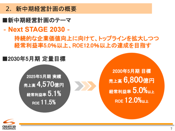 クリエイトSDは、前期決算発表時に新中期経営計画を公表。2030年までに売上高6800億円、経常利益率5%、ROE12%以上という目標を設定した。その実現のために出店エリアを拡大し、北関東や甲信越への進出を強化する。