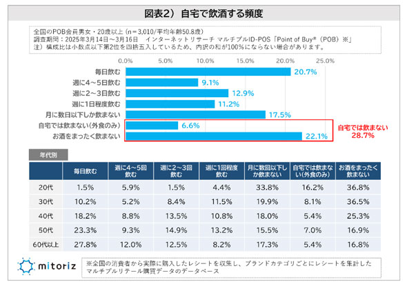 消費者の購買行動などを分析するmitoriz(ミトリズ)が実施した自宅での飲酒に関する調査では、40代の18.2%が「毎日飲む」と回答した一方、20代では「毎日飲む」がわずか1.5%にとどまり、「全く飲まない」は36.8%に上っている。