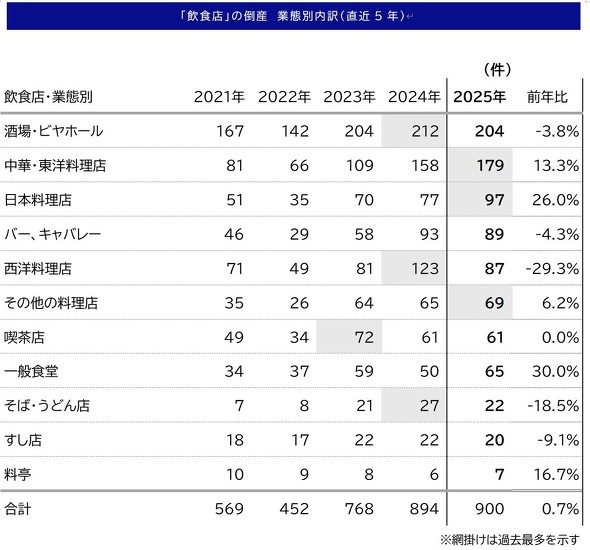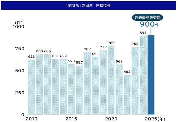 帝国データバンクの調査によると、2025年の飲食店の倒産件数は900件に達し、前年(894件)を0.7%上回って過去最多を更新した。