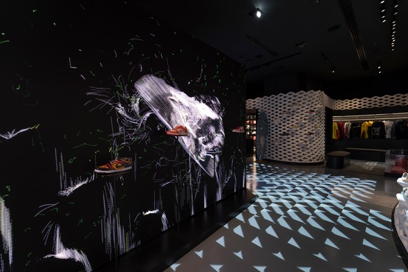 特筆すべきは「Presentedby x Level Shoes」というストリートウェア&スニーカーセクションです。スペイン・バルセロナを拠点とする建築事務所External Referenceがデザインを手掛けたこのエリアは、3Dプリント技術を活用した格子状の壁面構造が特徴で、スニーカーを斜めに陳列することで、複数の視点から商品を鑑賞できる仕組みとなっています。