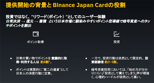 Binance Japan Cardが示しているのは、商品の中身を変えなくても、届け方を変えれば、届く人が変わるという事実である。「投資」を「ポイント」に言い換え、「買う」を「もらう」に置き換える。それだけで、同じものでも違って見える。