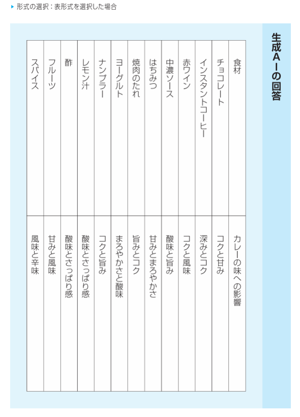 すると、生成AIは指定された「食材」と「カレーの味への影響」という列を持つ表を使って、回答してくれます。