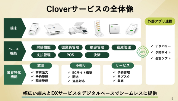 そのFiservが中小事業者向けに展開するのがCloverである。2013年にサービスを開始し、現在は米国、カナダ、ドイツ、オーストラリア、ブラジルなど12カ国で70万社以上が利用する。Fiservの説明によると、年間の決済取扱高は3000億ドルを超える。日本は13カ国目の展開国となる。