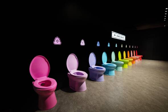 施設内にはいくつものアトラクションがあるが、中でも人気が高いのは、入り口を入ってすぐの「MY UNKO MAKER(マイうんこメーカー)」だ。ずらっと並ぶカラフルな便器から好きな色を選んで座ると、カラフルなうんこが便器に登場する。これを「マイうんこ」と呼んで、棒を取り付けて写真撮影のアイテムにするほか、お土産にもなる。
