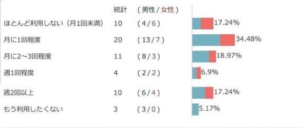 利用頻度は「月に1回程度」(34.5%)が最多で、「月2〜3回程度」(19.0%)、「週2回以上」(17.2%)が続いた。一方で「ほとんど利用しない(月1回未満)」と回答した人も17.2%いた。