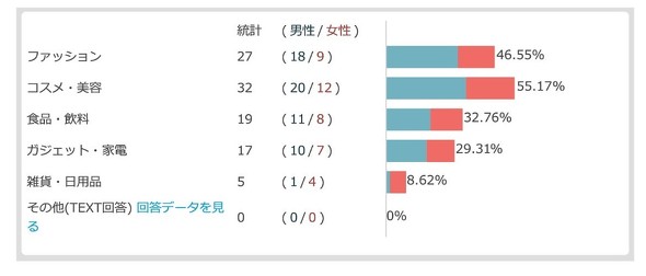購入ジャンルは「コスメ・美容」(55.2%)が最も多かった。以降「ファッション」(46.6%)、「食品・飲料」(32.8%)、「ガジェット・家電」(29.3%)が続いた。コスメ・美容やファッションでは、男性の購入比率がやや高い傾向も見られた。