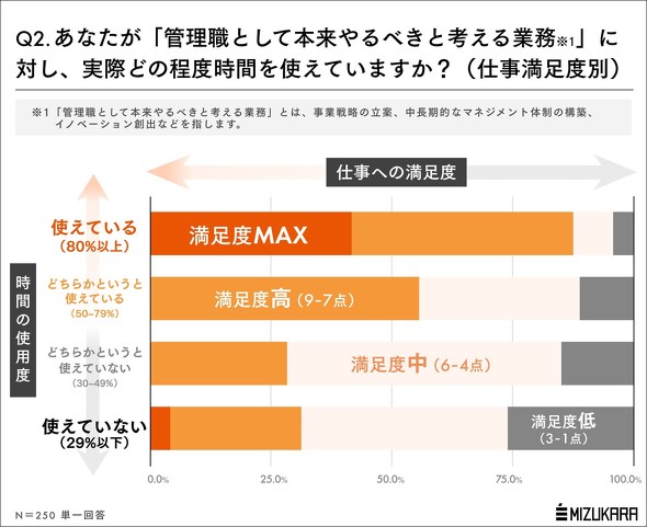 管理職の時間の使い方と仕事の満足度の関連についても調査した。事業戦略の立案や中長期的なマネジメント体制の構築など、管理職が「本来やるべき」と考える業務に十分な時間を充てられている人ほど、仕事への満足度が高い傾向が見られた。
