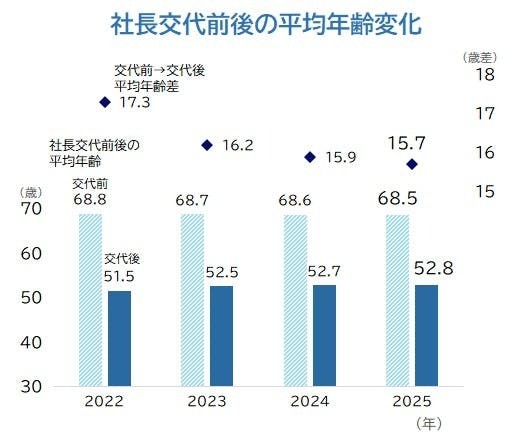 帝国データバンクは「事業承継を行う社長の引退の早期化が徐々に進む一方で、引き継ぐ新社長の年齢が上昇しており、若返り幅は近年、縮小傾向で推移している」と分析。2025年は物価上昇や人手不足、インボイス制度の本格運用など、中小企業の経営環境が厳しく、交代を先送りする動きもみられた。