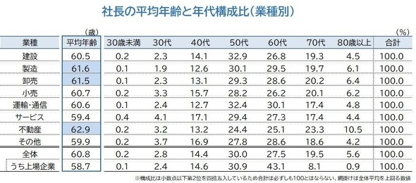 業種別では「不動産」が62.9歳で最も高齢だった。「製造」(61.6歳)、「卸売」(61.5歳)が続いた。開発ソフトウェアなどのIT企業を含む「サービス」は59.4歳で、「その他」を除く業種で唯一60歳を下回った。