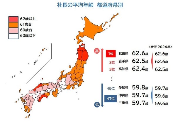 都道府県別では「秋田県」が最も高く62.6歳だった。以降「岩手県」(62.5歳)、「高知県」(62.4歳)が続き、東北6県はいずれも全国平均を上回った。