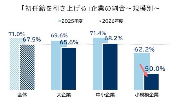 帝国データバンクが実施した調査によると、2026年4月入社の新卒社員の初任給を前年度から引き上げる企業は67.5%に上った。前年(71.0%)から3.5ポイント低下したものの、依然として約7割を占めている。