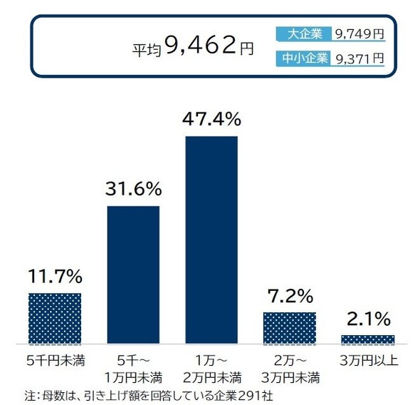 平均引き上げ額は9462円で、前年から348円増加した。規模別では「大企業」が9749円、「中小企業」が9371円だった。