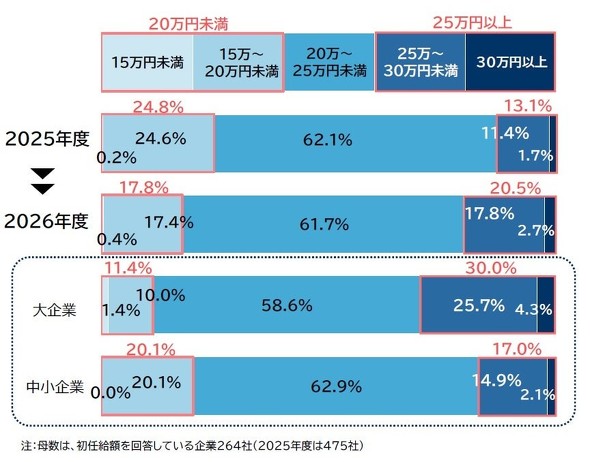 初任給の水準では「20万〜25万円未満」が最も多く61.7%に上った。「25万〜30万円未満」(17.8%)、「15万〜20万円未満」(17.4%)が続いた。「25万〜30万円未満」は前年度から6.4ポイント増加した一方、「20万円未満」は17.8%と前年度より7.0ポイント低下した。