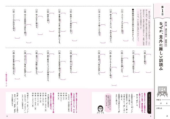 『解きながら身につける 大人の語彙力』では、漢字の読み書きや熟語の意味、ことわざや慣用句、敬語などを幅広く扱う。「欺く」(あざむく)、「労わる」(いたわる)、「賄う」(まかなう)といった意外と迷いやすい訓読みや、「真鯛兜煮」(まだいかぶとに)、「芙蓉蟹」(フーヨーハイ、かに玉のこと)といった料理名など、日常生活で目にする言葉も収録した。シリーズ全体の中でも特に人気が高く、重版の予定も決まっている。