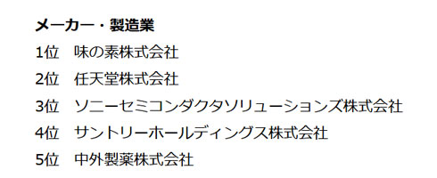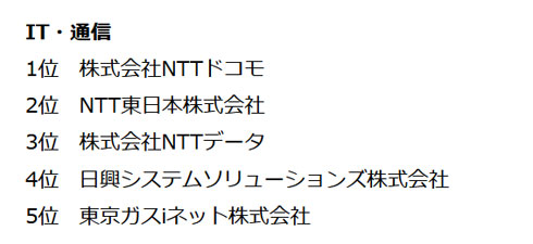 メーカー・製造業の2位は「任天堂」、3位は「ソニーセミコンダクタソリューションズ」という結果に。IT・通信では「NTTドコモ」が最も多く、次いで「NTT東日本」「NTTデータ」だった。