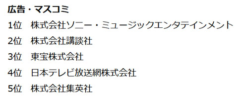 広告・マスコミは「ソニー・ミュージックエンタテインメント」「講談社」「東宝」、金融は「農林中央金庫」「オリックス」「三菱UFJ信託銀行」、小売りは「ユニクロ」「高島屋」「日本調剤」、商社は「三菱商事」「三井物産」「住友商事」がそれぞれ上位に並んだ。