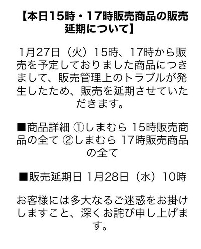 その象徴的な出来事が、衣料品チェーン「しまむら」グループのネット販売サイト「しまむらパーク」における予約販売中止である。しまむらは1月27日午後1時から「ボンボンドロップシール」の予約販売を予定していたが、アクセスが殺到し、販売が困難になったとして直前に中止を発表した。