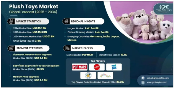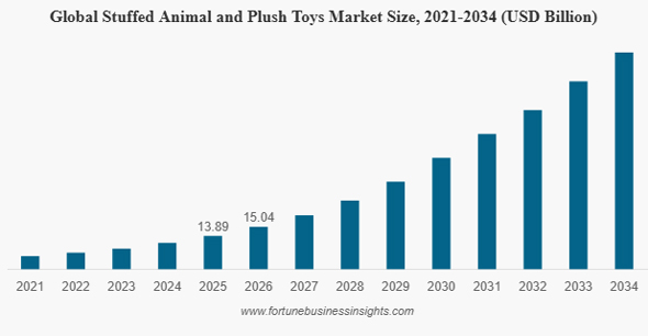 インドの調査会社であるフォーチュン・ビジネス・インサイトなど多くの調査会社が、世界のぬいぐるみ市場規模を138億〜150億米ドル(日本円で約2兆1314億〜2兆3167億円)と見ており、年間3〜8%の成長を見込んでいる。2034年には285億米ドル(約4兆3569億円)まで拡大するという予測もある。