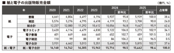 足元では、出版業界の調査機関である出版科学研究所(東京都新宿区)が発表した「出版指標」によると、2025年の紙の出版市場は前年比4.1%減の9647億円と、1976年以来初めて1兆円を下回った。
