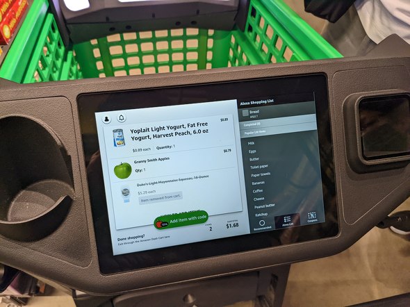 Goの品ぞろえ限界に加え、JWOの大型店舗でのコスト課題を受けて、Amazonが食品スーパーマーケットの主力として据えたのが、タブレット端末が搭載されたAIレジカートの「Amazon Dash Cart」でした。