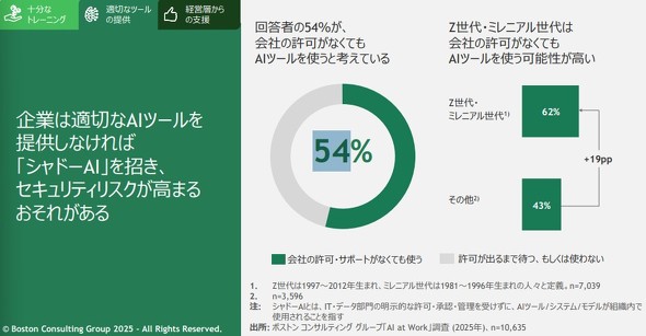 ボストン・コンサルティング・グループの「AI at Work 2025」調査によれば、世界で54%もの労働者が正式な許可なしにAIツールを使っているという。