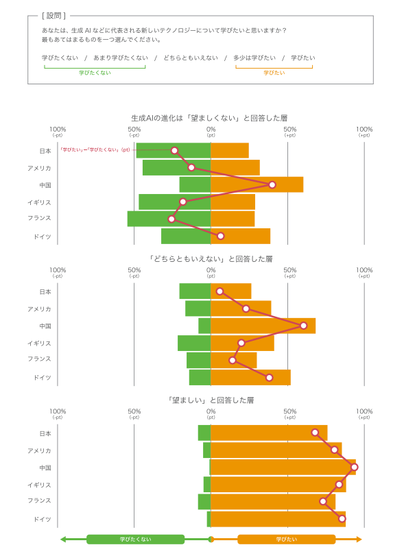 この日本の消極的な姿勢と対照的なのが中国だ。中国は「AIの進化が望ましい」とする回答が圧倒的に多く、学びに対しても極めて意欲的だ。加えて中国の働き手は「将来のキャリアチェンジ」を強く意識してAIを学ぼうとしており、国を挙げた技術革新を自身のステップアップの好機と前向きに捉えている姿勢が鮮明になった。