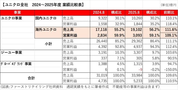ユニクロを展開するファーストリテイリングの売り上げを見てみると、56.2%は海外ユニクロが稼いでいることが分かります。営業利益では59.1%と6割近い数字です。2025年度は前期比で111.6%と2桁成長しており、国内ユニクロよりも伸びています。ユニクロが海外で存在感を高め、もうかるブランドになっていることがうかがえます。