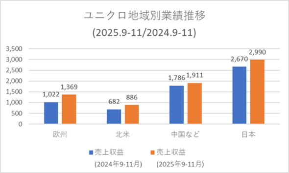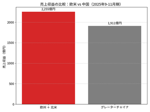 直近の2026年8月期の第1四半期(2025年9〜11月)の地域別売り上げでは欧州、北米地域が大幅増収を達成しました。中国市場が伸び悩む中、欧州と北米市場の売り上げが中国市場を抜くまでになりました。この勢いは今後も続きそうです。
