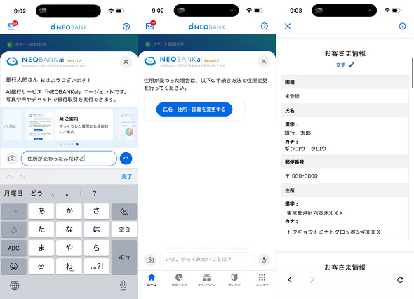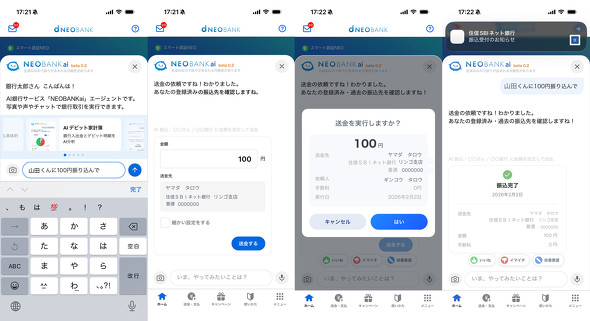 利用者は銀行アプリのホーム画面からNEOBANK aiを起動し、テキストや音声で話しかける。「田中さんに1万円送りたい」と入力すれば振込画面が立ち上がり、知りたい情報や必要な手続きへ直接案内される。iOSでは音声の読み上げにも対応しており、画面を見ずに会話だけで振込を完了させることもできる。