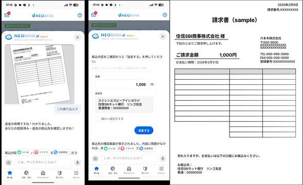 画像認識を使った振込にも対応した。請求書の写真やPDFのキャプチャをAIに読み込ませると、振込先と金額を自動で判別し、そのまま送金手続きに進める。
