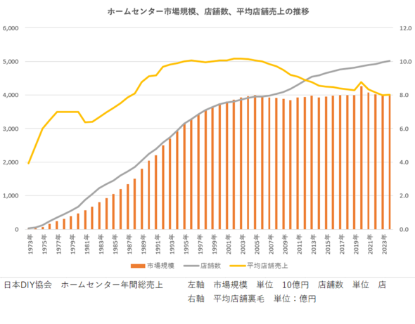 HCの市場規模は、直近の約20年間は4兆円前後の横ばいで推移しており、ほとんど増えていない(図表1)。HC需要は日用雑貨、DIY、ガーデニング、ペット、軽家電など、家に関連した需要であるため、新築の戸建てが増えないと拡大する見込みがほとんどないのが理由だ。地方では人口減少が進み、空き家が急増しており、今後さらに市場が縮小することが懸念されている。