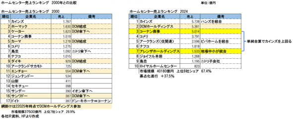 3位コーナンなどの大手各社も、中小のM&Aを実施しながら成長を続けた。5位のアークランズも、アークランドサカモトとビバホームという上位企業が統合してできたものだ。