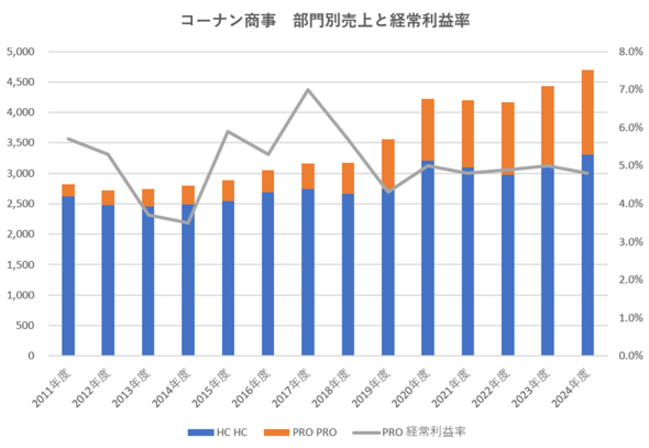 しかしコーナンの場合、今回のTOBにより市場縮小の懸念がほとんどない3大都市圏を押さえたことに加え、プロ向けという成長業態を確立しているため、成長性では負けない可能性がある。コーナンのHC事業の売り上げはこの10年で800億円ほど増えており、プロ向け事業の売り上げが1000億円以上伸びているため、カインズやDCMとの差を徐々に縮めることができた(図表4)。プロ向けの業態はリフォーム業者向けが中心で、大都市周辺に豊富なニーズがあるため、大都市を基盤とするコーナンには今後も十分な成長余地がある。
