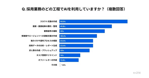 AIの活用シーンでは「スカウト文面の作成」が最も多く50.9%に上った。以降「面接・面接結果の要約・整理」(41.6%)、「書類選考の補助」(35.0%)、「候補者やエージェントへの連絡文面の作成」(30.4%)が続いた。