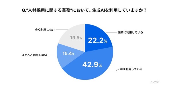 採用業務においてAIを「頻繁に利用している」人は22.2%、「時々利用している」は42.9%だった。
