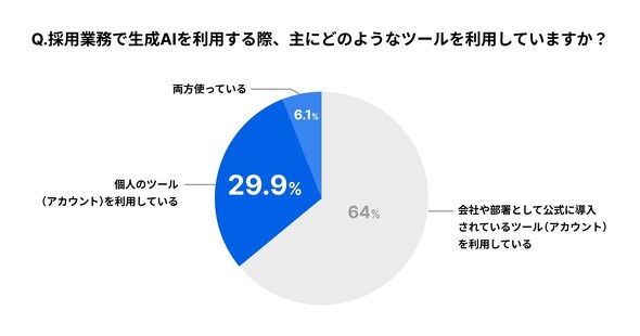 利用しているAIツールは「会社や部署として公式に導入されているツール」が最も多く64.0%に達した。一方で公式に導入されていない「個人のAIツール(アカウント)」は29.9%、「両方」は6.1%だった。