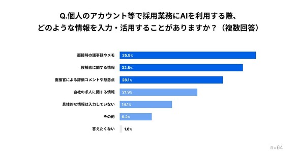 一方、個人のAIツールを利用している人が、入力している情報としては「面接時の議事録やメモ」(35.9%)が最も多かった。「候補者に関する情報」(32.8%)、「面接官による評価コメントや懸念点」(28.1%)、「自社の求人に関する情報」(21.9%)が続いた。
