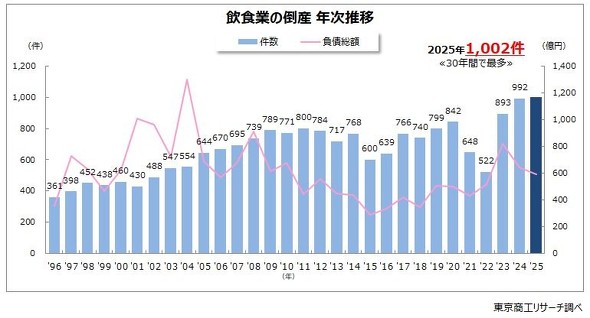 2025年、飲食業の倒産件数が1996年以降の30年間で初めて1000件を超えた。その数は1002件(前年比1.0%増)に上り、資本金1000万円未満の小・零細規模が886件(同0.1%減)と大多数を占めた。