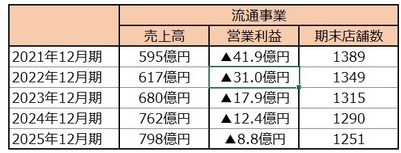 増収の要因について、同社は直営店舗数の増加を挙げている。2025年度における既存店売上高は前年比2.4%増であるのに対し、流通事業では約5%も伸びていることから、近年の増収は本部による出店や加盟店の吸収が影響していると考えられる。