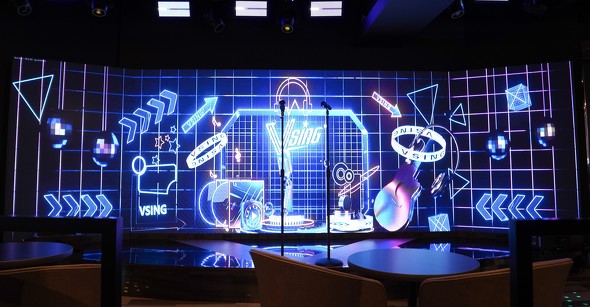 誰でも参加できるオープンなフロアに、大型LEDや照明演出を備えたステージが設置され、ライブハウスのような雰囲気を演出。利用者はそのステージに立ち、観客に囲まれながら歌唱する。