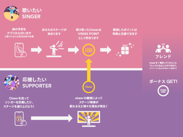 ただし、VSINGにおいて注目すべきは、その構図がビジネスとして精緻に設計され、制度化されている点にある。従来は場の雰囲気や偶発的な盛り上がりに委ねられていた「歌う」と「応援する」という行為が、アプリやポイント制度、ランキング機能などによって可視化され、経済的価値と結び付けられている。VSINGでは、偶発的な盛り上がりではなく、「応援される構図」そのものが設計されているのだ。