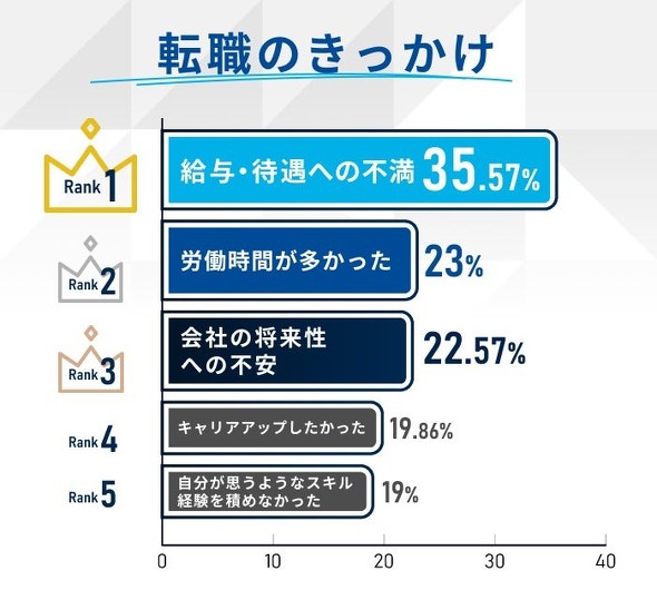 転職メディア「転職UPPP」を運営するUPPGO(東京都品川区)は、30代の転職経験者を対象に「転職活動や転職エージェント・サイトに関する調査」を実施した。その結果、転職のきっかけ1位は「給与・待遇への不満」(35.6%)だった。