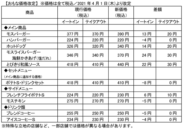 2021年4月、モスの代表的な商品「モスバーガー」が370円から390円に値上げされた。他の商品も20〜30円の値上げとなった。