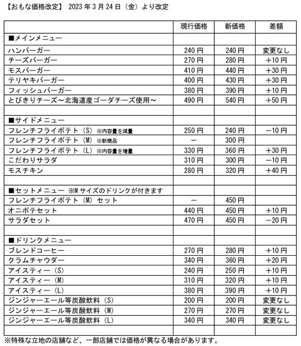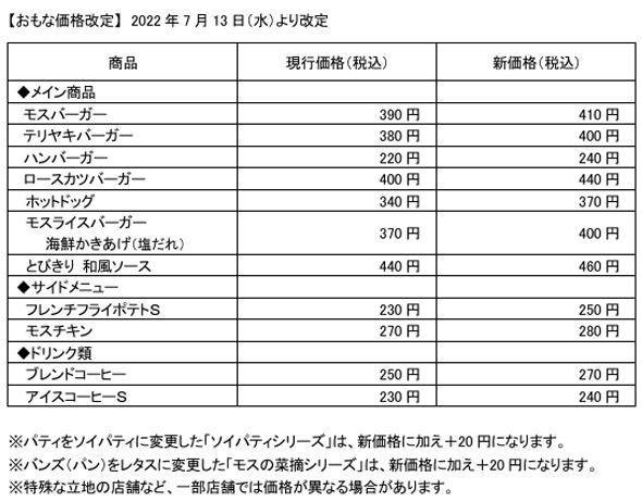 翌年の2022年7月、モスバーガーは390円から410円に値上げされた。他のメイン商品も20〜40円上がっている。