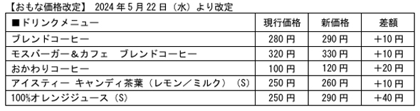 2024年5月はハンバーガーなどの値上げはなかったが、一部ドリンク商品が値上げされた。ブレンドコーヒーが280円から290円になったほか、100%オレンジジュースに関しては40円も高くなった。