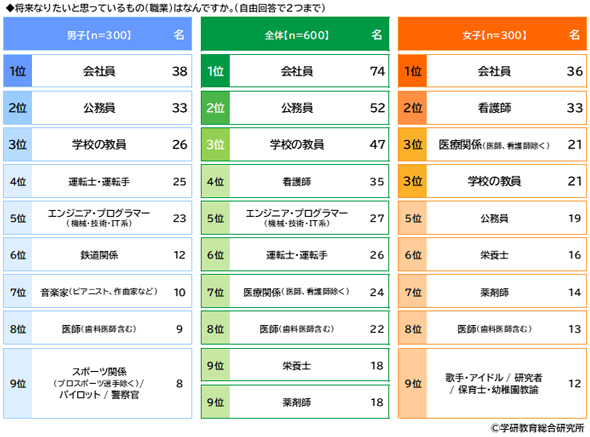 男女別では、男子のTOP3は1位「会社員」(38人)、2位「公務員」(33人)、3位「学校の教員」(26人)。女子は男子と同様に1位「会社員」(36人)で、2位「看護師」(33人)、3位「医療関係(医師、看護師除く)」「学校の教員」(いずれも21人)と続いた。